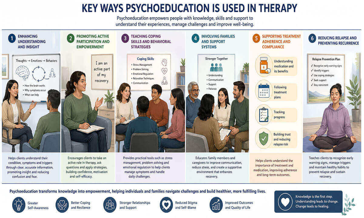 Psychoeducation is a therapeutic approach that involves providing clients and their families with structured information about mental health conditions, treatment options, coping strategies, and recovery processes. It goes beyond simply giving information by helping individuals understand how their thoughts, emotions, and behaviors are connected, enabling them to actively manage their mental health.